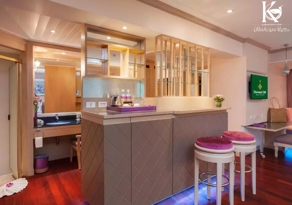 مرکز خرید محبوب Jungceylon و جاده Bangla کمتر از 2 کیلومتر با هتل فاصله دارند.اتاقهای هتل دیاموند کلیف ریزورت و اسپا دارای منظره غروب آفتاب خیرهکننده از بالکنهای خصوصی هستند. هر کدام دارای کفپوش چوبی صیقلی و تلویزیون کابلی/ماهواره ای هستند. یک مینی بار و یخچال نیز در هر اتاق ارائه شده است.مهمانان می توانند از مرکز تناسب اندام استفاده کنند یا در زمین تنیس بازی دوستانه ای داشته باشند. Diamond Spa دارای طیف گسترده ای از ماساژهای آرامش بخش و درمان های زیبایی است.این هتل رستوران در فضای داخلی و هم در فضای باز را ارائه می دهد و مجموعه ای از غذاهای بین المللی، تایلندی، ژاپنی، ایتالیایی و غذاهای دریایی را سرو می کند.