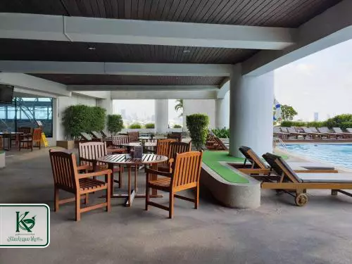 استخر روباز و محوطهی آفتابگیری هتل، بالاتر از هیاهوی شهر قرار گرفتهاند تا مهمانان بتوانند در آرامش، حمام آفتاب بگیرند و از منظرهی خیرهکنندهی غروب بر روی رودخانهی چائو فرای لذت ببرند. در کنار استخر، انواع نوشیدنی و خوراکیهای لذیذ سرو میشود که گزینهای ایدهآل برای صرف یک وعده غذایی خانوادگی، استراحت بعد از خرید و یا گشتوگذار شهری است.