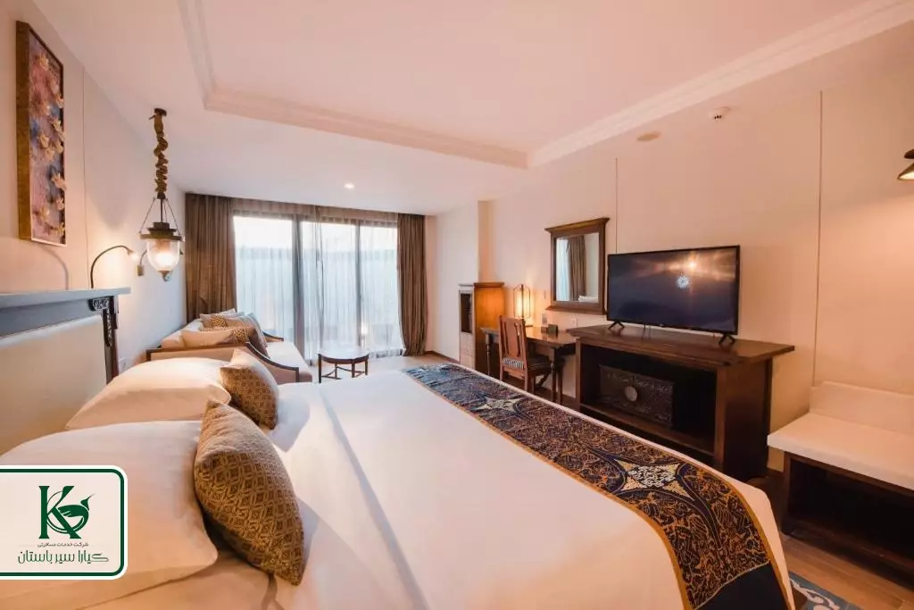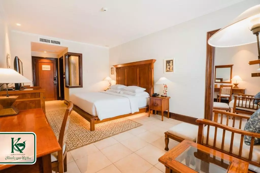 اتاق های آرامش بخش دارای حمام اختصاصی، Wi-Fi، تلویزیون هوشمند، تجهیزات تهیه چای و قهوه هستند. اتاق های سطح بالاتر تخت خواب و یا بالکن دارند، در حالی که کلبه ها مشرف به استخر هستند. اتاق های خانوادگی تخت های اضافی نیز ارائه می دهند.